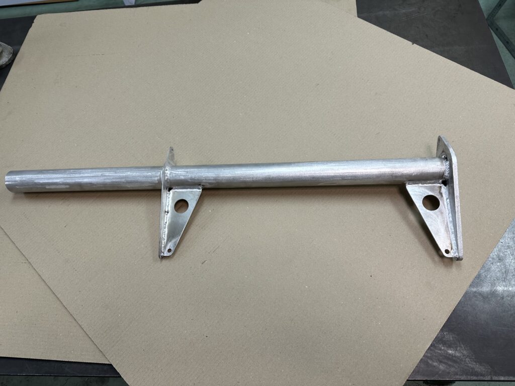 ポイントとしては、アルミの丸パイプにプレートを溶接している点で、溶接による歪みを抑えながらアルミの熱縮みによる影響を加味したサイズに加工することで製品を仕上げています。さらに、丸パイプの厚みが3mmと薄肉パイプであることから板を溶接する過程でアルミパイプが曲がらないよう、溶接順を工夫し入熱量の調整を行いました。