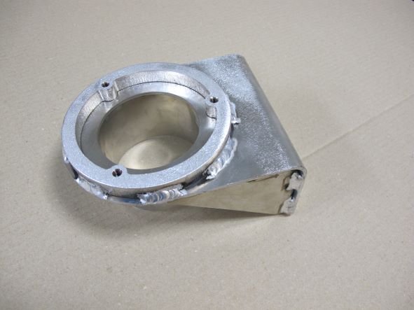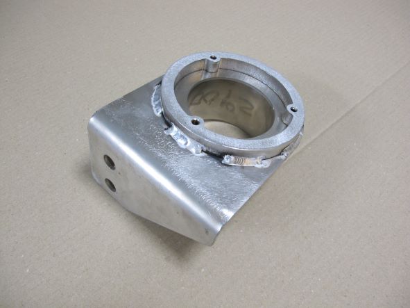 ポイントとしては2点あり、1点目は12mmのフランジ部です。規格品には存在しないサイズと形状であるため特注製作となりますが、機械加工で製造するとコストが高くつくため、12mmの板からレーザー加工により切り抜いて製造しています。(フランジ部の穴加工箇所にはヘリサートを挿入しています。)また2点目としては、ボディ部分の曲げ板とリブの溶接に加え、フランジ部とボディ部を溶接している点があげられ、特にフランジ部はt12mmでボディがt1.6mmで構成されているので溶接をする際に入熱量を考慮し、電流・電圧・パルス条件を調整し、ボディ部が溶けないように気を配りながらフランジ部の溶接を行っています。